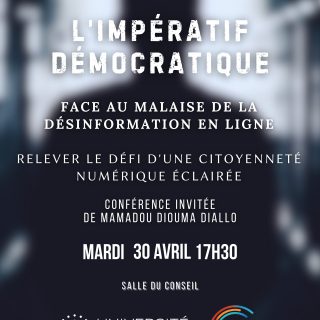L’impératif démocratique face au malaise de la désinformation en ligne: relever le défi d’une citoyenneté numérique éclairée Mardi 30 avril 17h30 – 19h30 Campus Carlone – Salle du Conseil Mamadou Diouma DIALLO,...