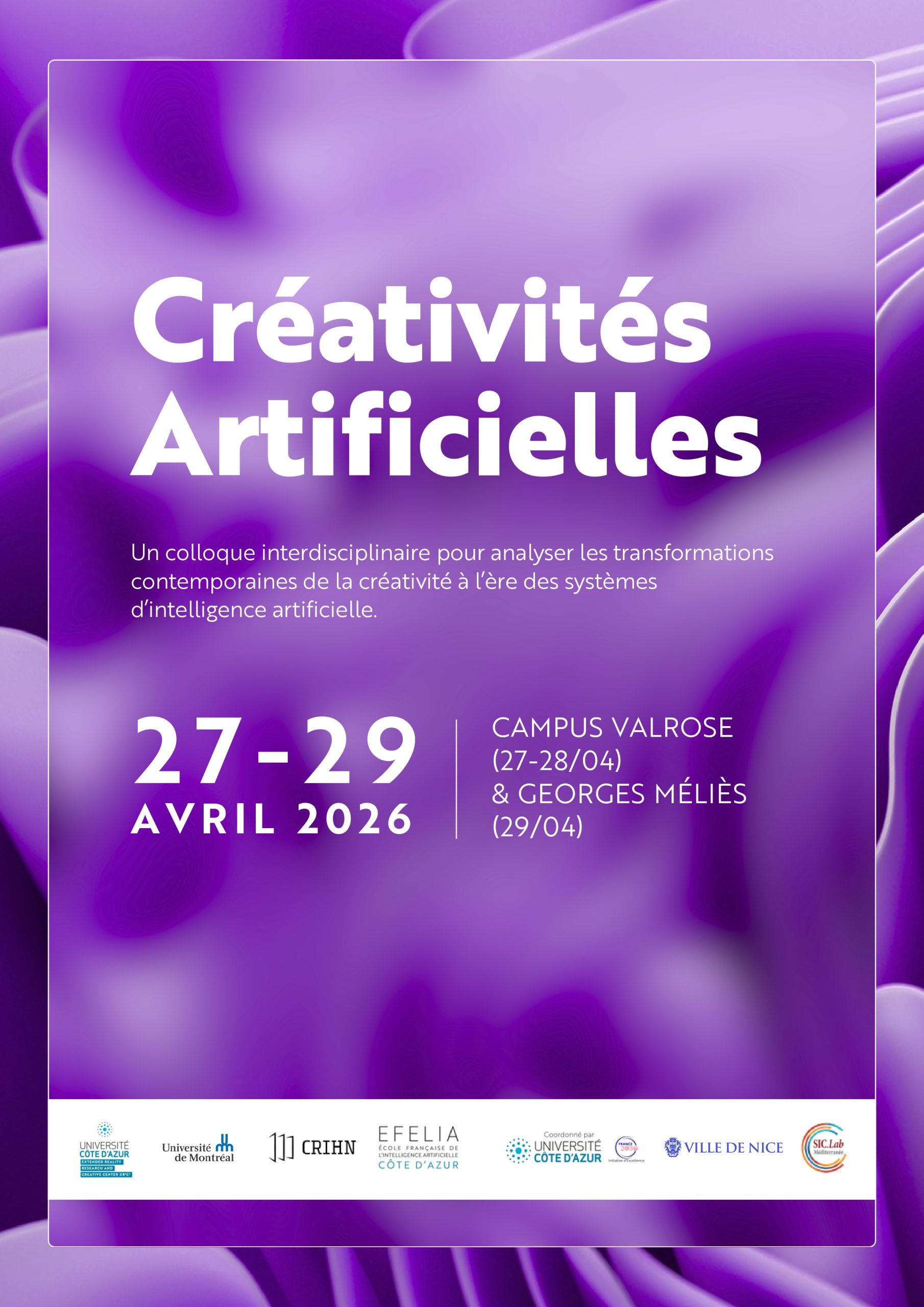 Du 27 au 29 avril 2026, le Centre XR2C2 organise un colloque de trois jours sur le lien entre création et IA en collaboration avec l’Université de Montréal (CRIHN), EFELIA, le SIC.Lab et la Ville de Nice.