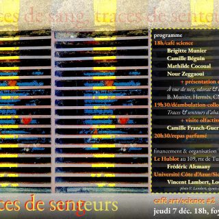 Traces de sang, traces de senteurs jeudi 7 décembre à 18h à l’Entre-Pont 109 – 89, route de Turin 06300 Nice Entrée libre 18h/café science : rencontre avec des scientifiques du sensible :...